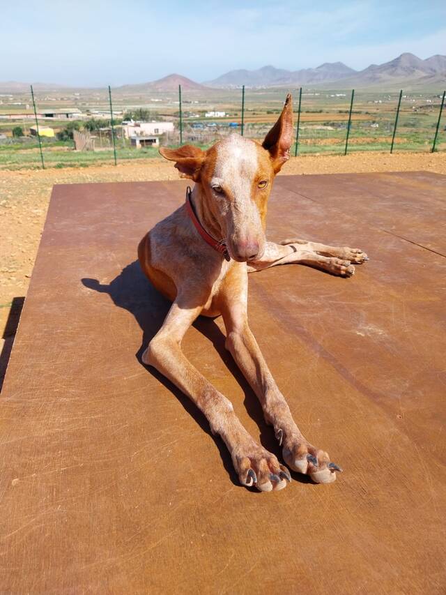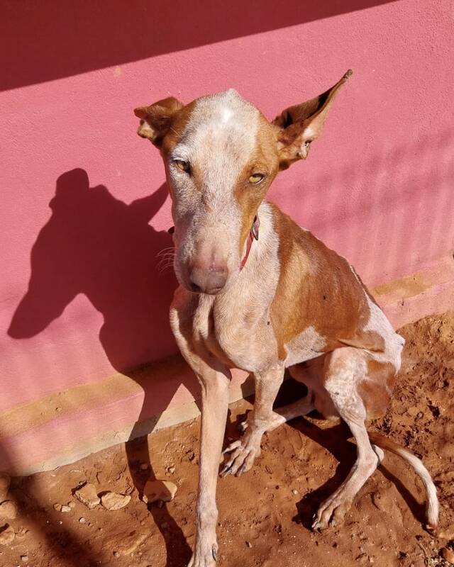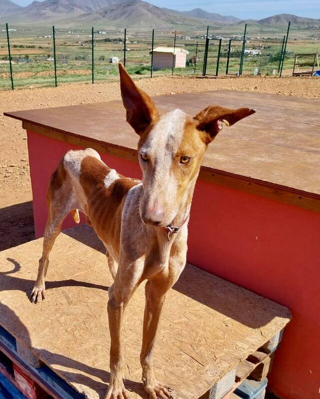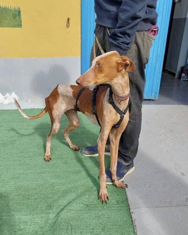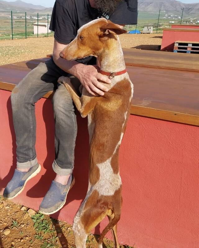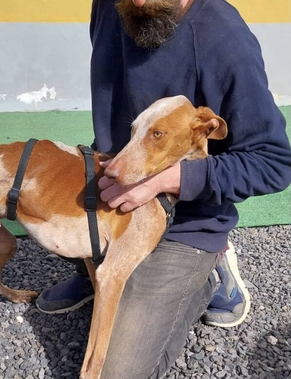 Zum Ende des Jahres 2025 konnten wir im Rahmen einer größeren Rettungsaktion nach Beendigung der Jagdsaison mehrere Podencos aus der Perrera holen. Dank vieler lieber Spenderinnen und Spender war es möglich, dass insgesamt acht Podencos, größtenteils stark abgemagert und geschwächt, die Perrera verlassen durften- unter ihnen war auch Rüde Jaro. Er durfte zu Sarah und Sven auf die Tierschutzfinca ziehen, wo er liebevoll betreut und versorgt wurde.