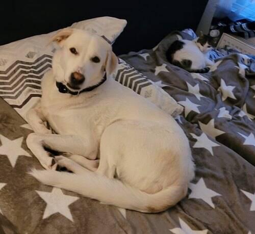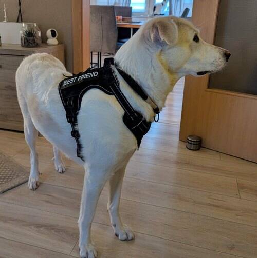 Update Februar 2026: White wurde als Welpe vermittelt und sucht nun leider unverschuldet wieder ein neues Zuhause. Sie hat sich zu einer stattlichen Hundedame mit etwa 37kg Gewicht entwickelt. White versteht sich super mit Katzen und ist im Haus super lieb und entspannt. Im Freilauf verträgt sie sich super mit anderen Hunden, an der Leine meckert sie ein wenig andere Hunde an. Grundkommandos wie Sitz, Bleib, Platz, Komm und Warte kann White super. Kinder kennt White nicht. Schmusen und chillen ist ihre Lieblingsbeschäftigung - sie liebt es eher gemütlich und ist auch keine Marathonläuferin.