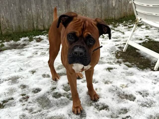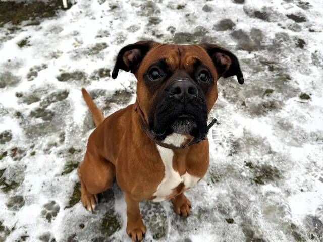 Boxertypisch hat Dobby ein paar Falten, die besondere Aufmerksamkeit und Pflege benötigen.