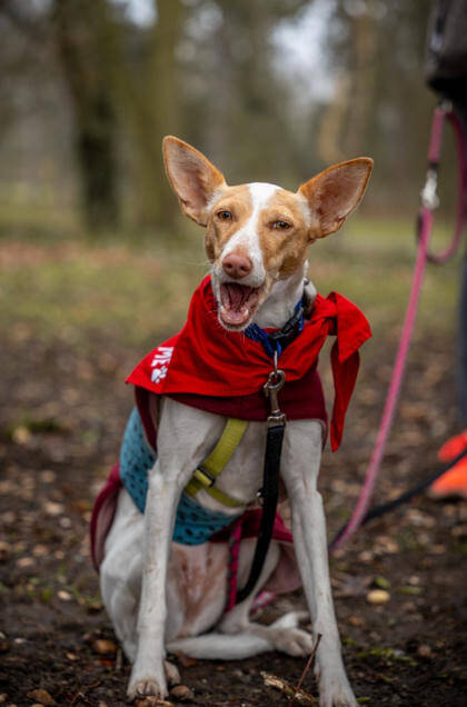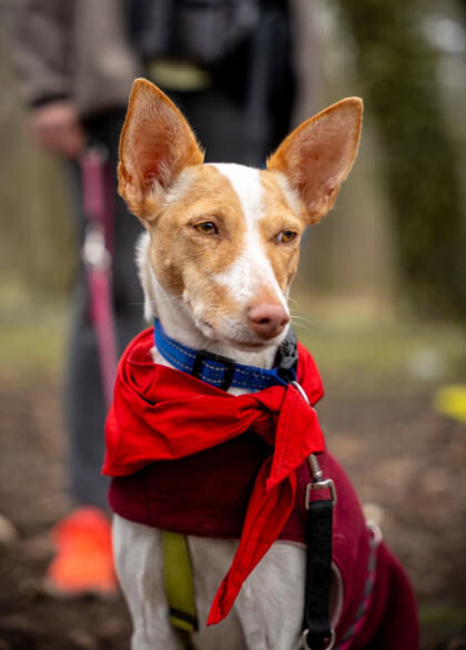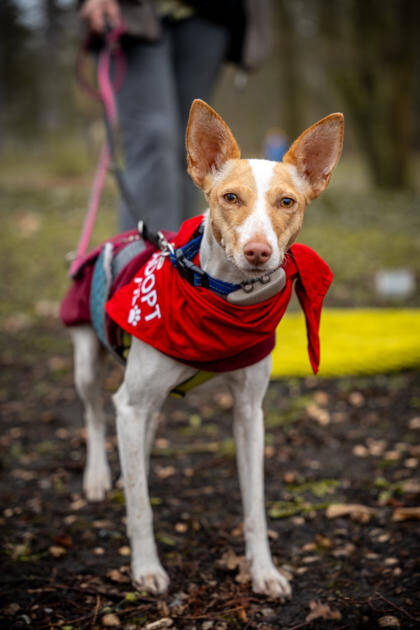 Menschen gegenüber ist Hada3 freundlich und kontaktfreudig. Sie zeigt sich verschmust und hat auch bei fremden Menschen keine Berührungsängste. Mit ihren Artgenossen ist sie verträglich, gerne tobt und spielt sie eine Runde. Wir können uns die Podenca sowohl bei weiteren Hunden wie auch als Einzelprinzessin vorstellen. Eine Katze könnte ebenfalls teils ihres neuen Rudels sein, allerdings sollte diese hundeerfahren sein, denn Hada3 könnte sie doch mal anbellen. Sie läuft schon ganz ordentlich an der Leine, hat als Podenca aber definitiv Jagdtrieb. Findet sie spannende Mauselöcher oder ihre Nase nimmt Fährte auf, vergisst sie schon mal ihre Leinenführigkeit. Sie hat sich aber auch für eine kleine Joggingrunde begeistern lassen und übt gerade das Laufen am Fahrrad. Treppensteigen kann sie und Autofahren klappt mittlerweile gut. Allein bleiben findet noch nicht so toll, aber sie übt fleißig. Generell scheint Hada3 lernwillig zu sein, hat schon "Sitz" gelernt und wartet brav, bis sie an der Reihe ist zum Anleinen.