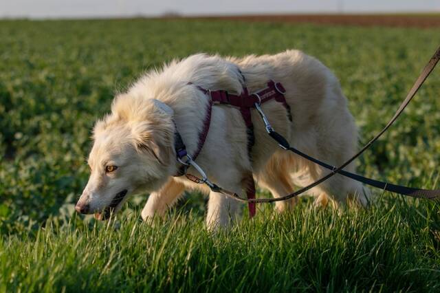 Inzwischen geht Beretta - gut gesichert - schon recht gerne spazieren. Besonders wenn ihre Hundekumpels mit auf den Spaziergang gehen. Radfahrer, Autos und normale Spaziergänger passiert sie schon recht gut. Laute Geräusche, Jogger, Kinder oder große LKW/Traktoren sind ihr noch unheimlich- dann legt sie sich meist auf den Boden. In ruhigen Gegenden kann Beretta auch längere Spaziergänge schon gut genießen, schnüffelt ausgiebig und läuft entspannt.
