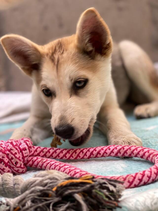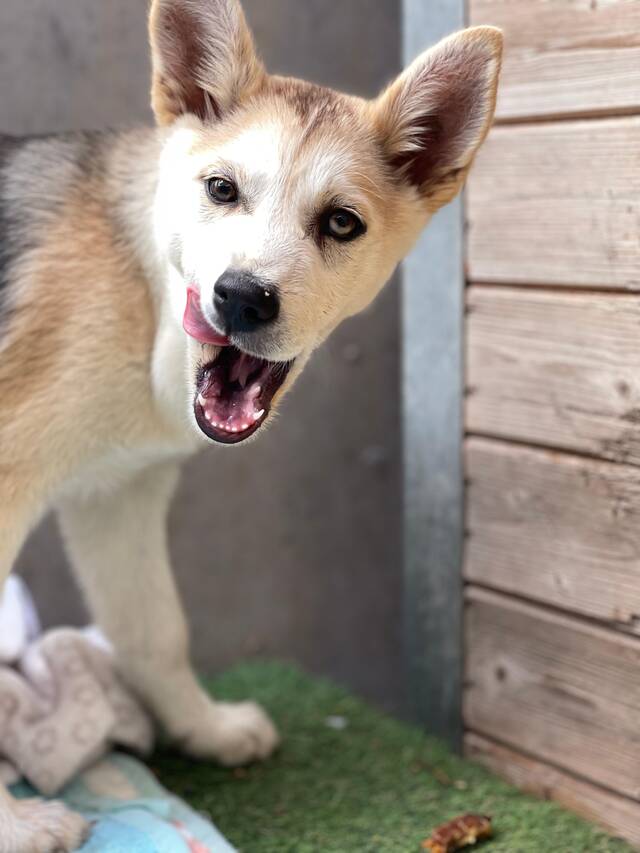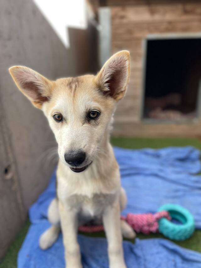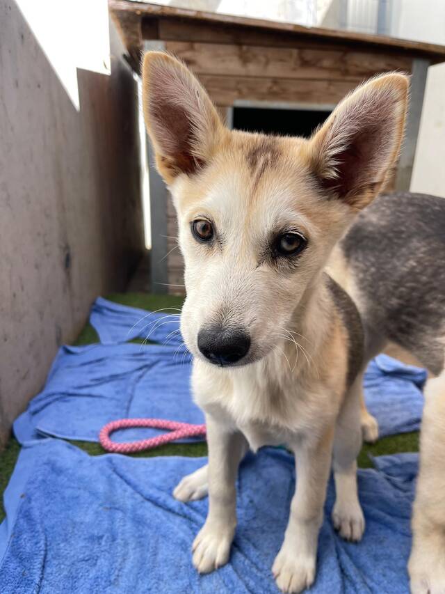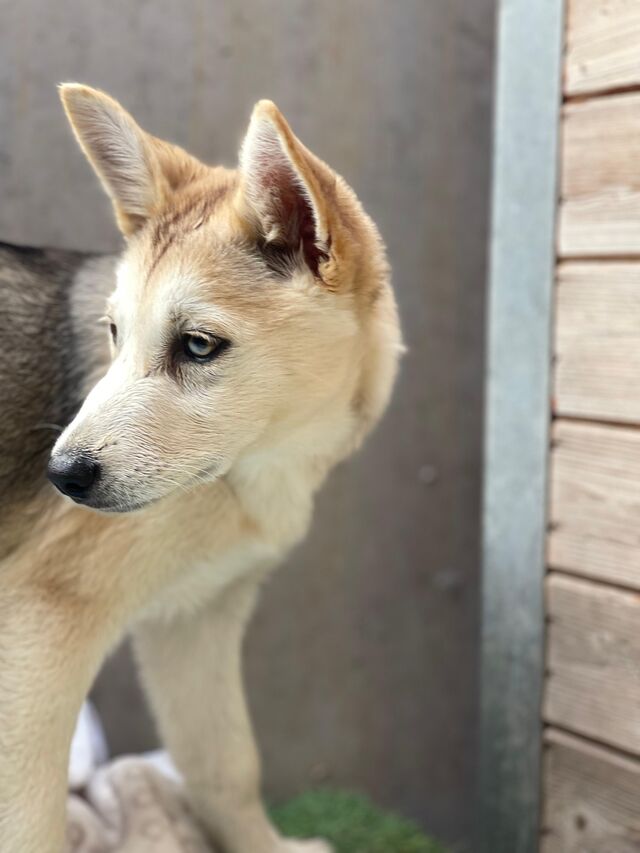 Alma ist ein wunderschöner Mischling, vermutlich mit Anteilen von Deutschem Schäferhund, Husky und nordischen Rassen. Sie wird einmal eine aktive und intelligente Begleiterin sein, die sowohl körperliche als auch geistige Auslastung braucht.