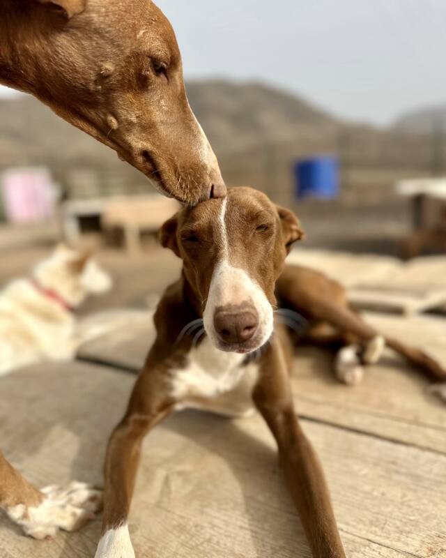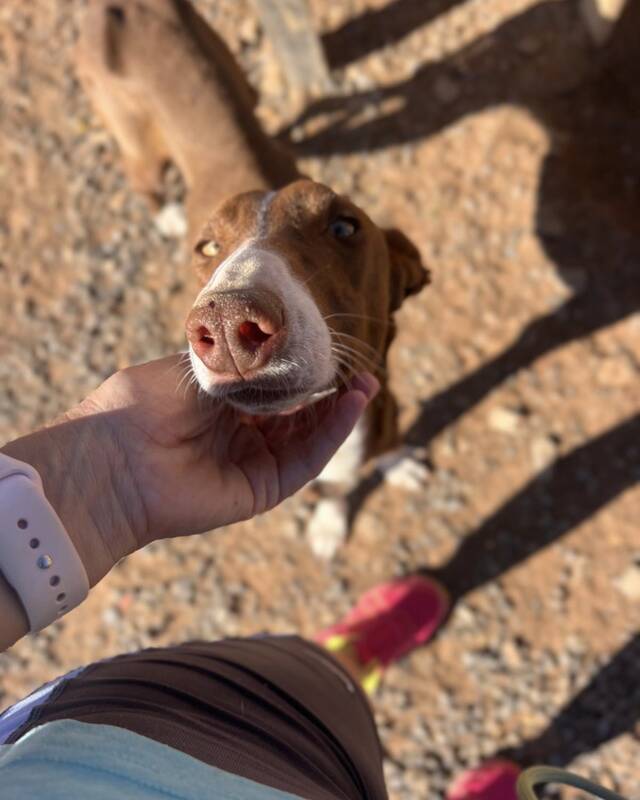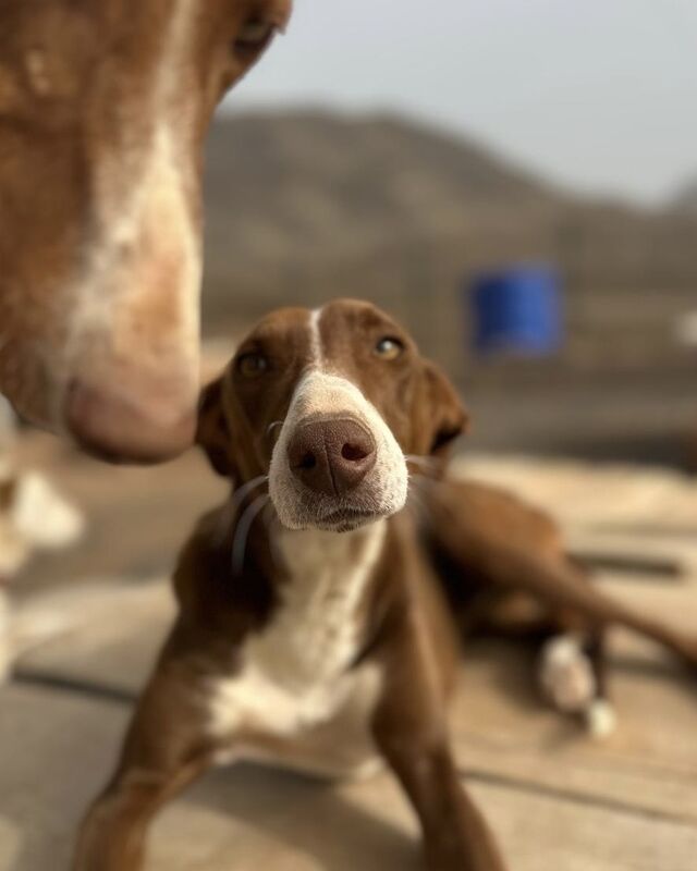 Im Umgang mit anderen Hunden zeigt sie sich noch unsicher. Im Podenco-Gehege reagiert sie meist unterwürfig und zieht sich zurück, besonders wenn andere Hunde ihre Unsicherheit ausnutzen. Konflikten geht sie konsequent aus dem Weg. Mit sanfteren Hündinnen beginnt sie jedoch langsam aufzutauen – erste vorsichtige Spielversuche zeigen, dass sie Vertrauen fasst und ihr Selbstbewusstsein wächst.
