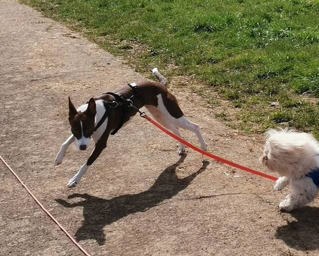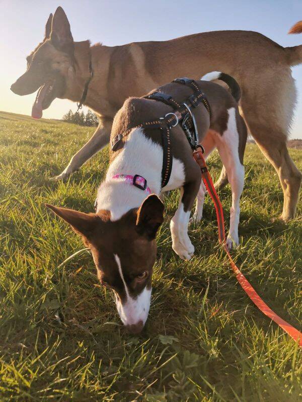 Sie bewegt sich gerne, ist aktiv und läuft freudig bei Spaziergängen mit. Ihr Jagdtrieb ist vorhanden, aber gut händelbar. An der Schleppleine lässt sie sich gut abrufen, und auch im normalen Alltag läuft sie brav an der Leine.