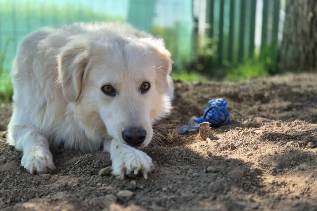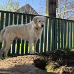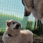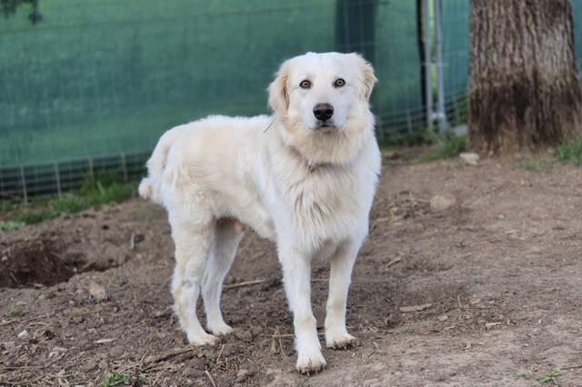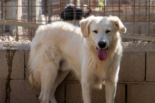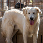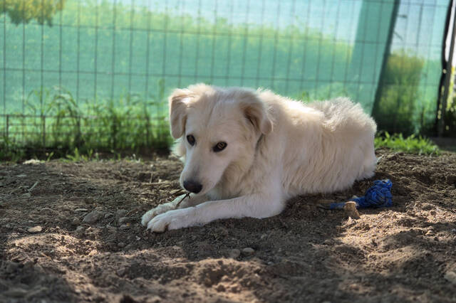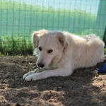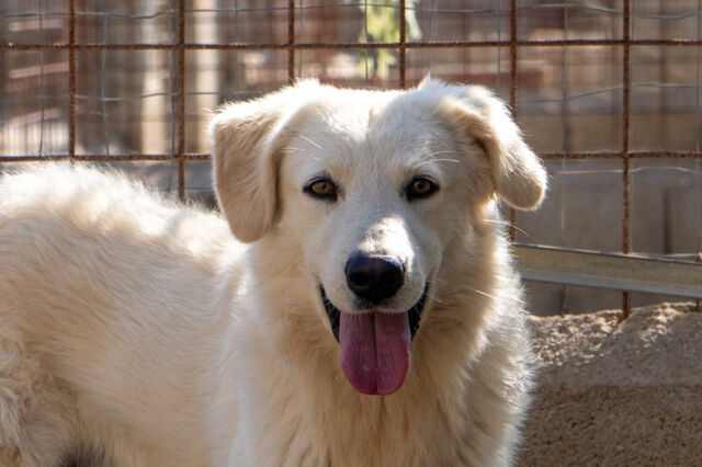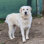 Gigio ist ein wunderschöner, weißer Maremmano-Mischling mit einem Blick, der einen sofort berührt: hellbraune, Augen, die von einer dunklen Umrandung eingefasst sind – als hätte jemand sie mit einem zarten Pinselstrich betont. Es sind Augen voller Sanftheit, Vorsicht und Hoffnung.