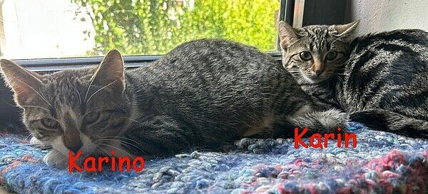 Karino und Karin sind noch etwas unsicher und ängstlich, lassen sich jedoch bereits gerne streicheln und sind sehr spielfreudig. Bei fremden Menschen sind sie noch vorsichtig.