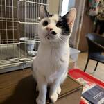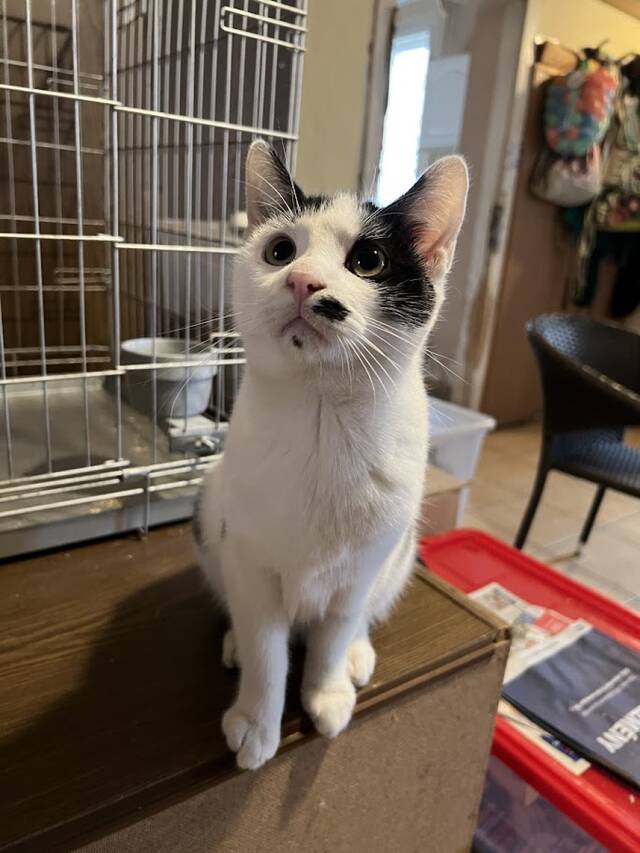 Orion ist ein hübscher weiß-schwarzer Kater mit einem ganz besonderen Erkennungszeichen: ein kleiner schwarzer Fleck an seinem Mäulchen, der wie ein winziger Stern aussieht – daher sein Name Orion.