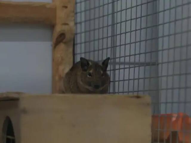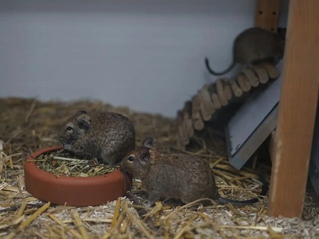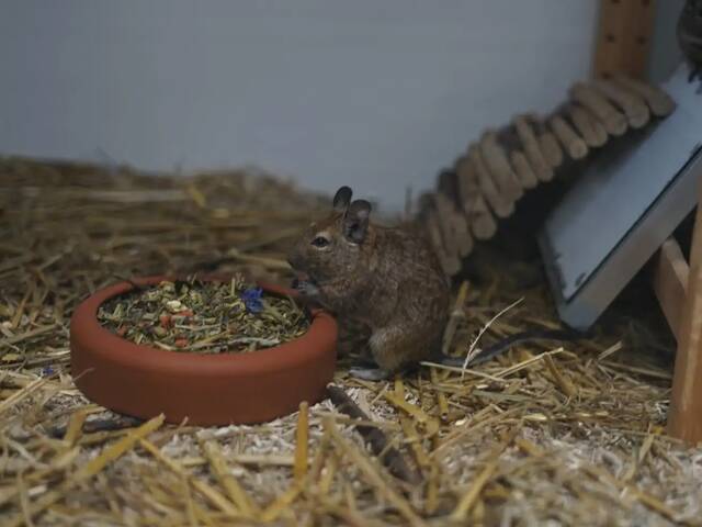 Nach anfänglicher Schüchternheit haben sich die Degu-Damen bei uns im Tierheim relativ schnell eingewöhnt. Besonders dann, wenn es etwas zu essen gibt, lassen sich die Damen blicken.