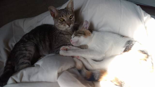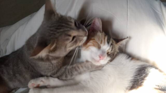 Sou wurde als winziges, krankes Katzenkind gefunden, geschwächt und voller Angst vor der Welt. Lange Zeit zog sie sich zurück, beobachtete alles aus der Distanz und brauchte viel Geduld, um Vertrauen zu fassen. Rosa hingegen kam ebenfalls krank und orientierungslos an, mit einer schweren Augeninfektion und ungewisser Zukunft. Doch auch sie ließ sich nicht unterkriegen. Beide Katzen haben sich Schritt für Schritt erholt – körperlich wie seelisch – und dabei zueinander gefunden.
