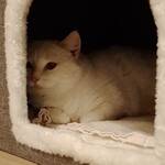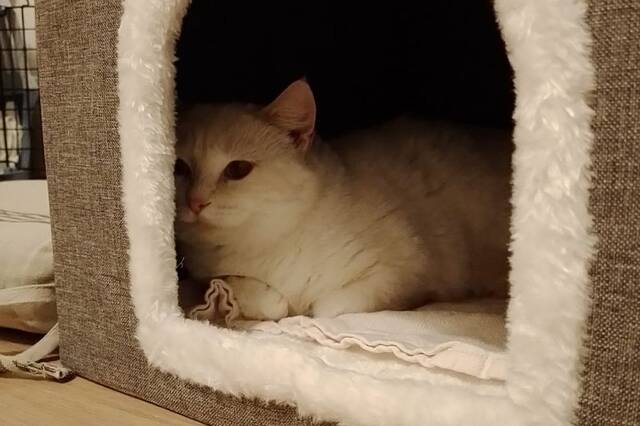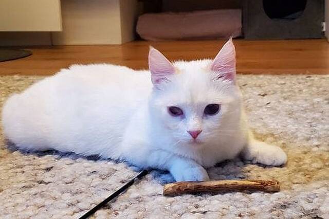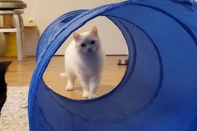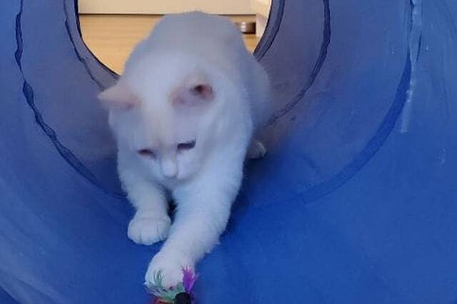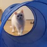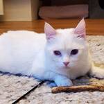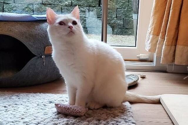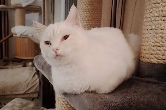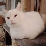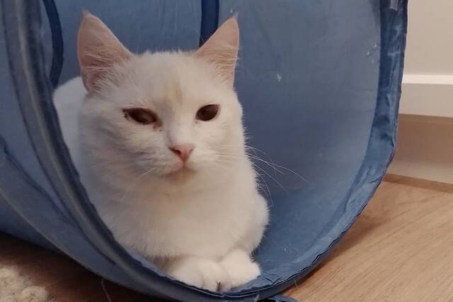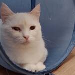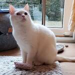 Checky ist eine zarte, schneeweiße Katzendame mit einem in warmen Rot- und Beigetönen gestreiften Schwanz. Eines ihrer Augen ist leider beschädigt, während das andere in einem strahlenden Blau leuchtet.