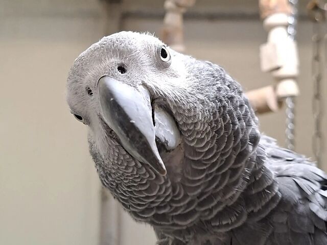 Mogli ist der Quatschkopf in der Gruppe, spricht und pfeift viel vor sich hin, auch ist er neuen Dingen gegenüber relativ schnell aufgeschlossen. Mogli kam ursprünglich mit einer inzwischen vermittelten Graupapageien-Dame aus dem selben Haushalt, wo sie getrennt gewohnt haben - hier im Tierheim hatten beide jedoch keine Probleme miteinander.