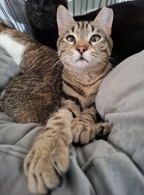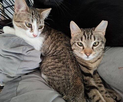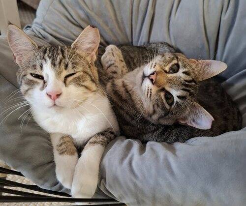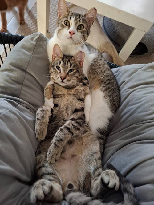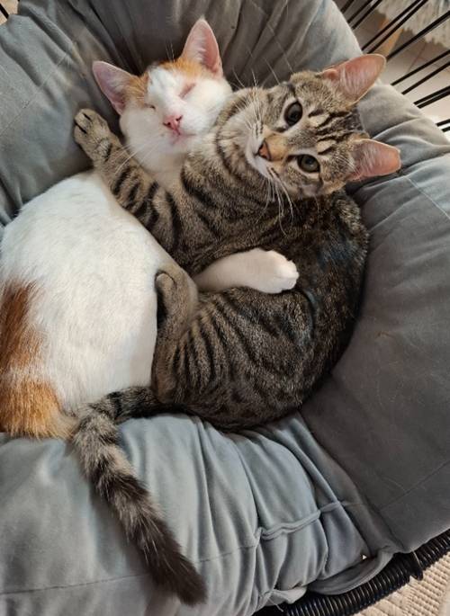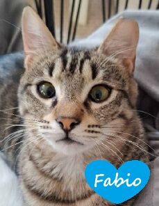 April 2026: Fabio und Mia sind zwar keine Geschwister, gehören aber zusammen wie Pech und Schwefel. Die Beiden wurden zeitgleich im Alter von etwa drei Wochen von einer Tierfreundin aufgenommen und haben seitdem ihren Weg gemeinsam bestritten, weshalb sie nur im Doppelpack vermittelt werden. Beide sind geschätzt sieben Monate alt, freundlich verschmust und bereits an das Katzenklo gewöhnt. Sie kennen andere Katzen und auch Hunde. Fabio hatte als Kitten Probleme mit seinen Augen (siehe Video), dies konnte aber gut behandelt werden.