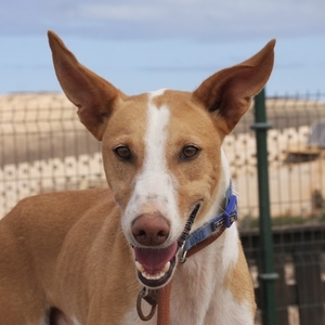 Raya ist eine außergewöhnlich sanfte und sensible Hündin, die in ihrer Vergangenheit viel durchgemacht hat. Einige Monate verbrachte sie in der Perrera in La Pared – eine Zeit, in der sie sich vor lauter Angst kaum von der Stelle bewegte. Immer eng an ihrer Gefährtin Kika, einer Podenco-Hündin, klammerte sie sich an das wenige, das ihr Sicherheit bot. Als endlich ein Platz auf unserer Finca frei wurde, durfte Raya zusammen mit Kika bei uns einziehen – ein Wendepunkt in ihrem Leben.